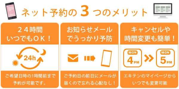 *エキテンの会員登録をされている方は、エキテンにログイン後の予約をおすすめします。ログインして予約されますとエキテンマイページより変更やキャンセルが可能となります。